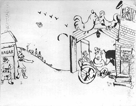 An Orgy Becomes a Brawl’, Marc Chagall, c. 1923' While Chagall’s etchings display a great sympathy toward the text, his unique style remains very much in evidence. Oversized elements; inconsistency of perspectives; and ‘floating’ characters, to name a few, are ever-present features of his dream-like world. Besides, the provincial settings in Dead Souls were the perfect environment for Chagall to explore his animal motifs, as he did continued to do throughout his career when depicting both peasant and Parisian life. Note how a gigantic cockerel has been added to the scene of Chichikov’s arrival. The cockerel is a recurrent motif in Chagall’s work, but also recalls the imagery of Russian folktales. Here, I think it could not be more in harmony with the troika (horse-drawn coach), the tea merchant and the two muzhiki (Russian peasants) that populate the scene. In using this motif, Chagall signs up both his own and Gogol’s work to a long Russian tradition.